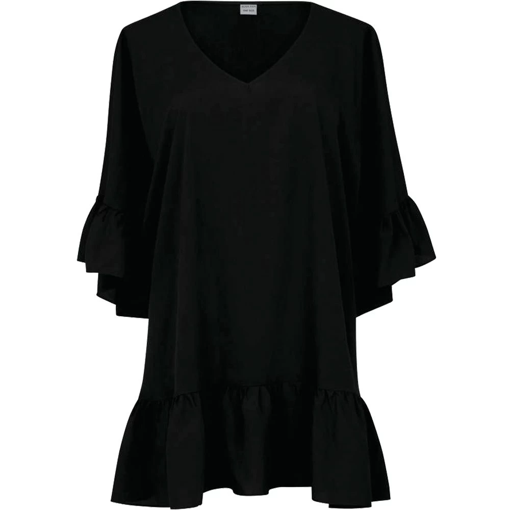Short, softly falling dress in deep black with a V-neckline.