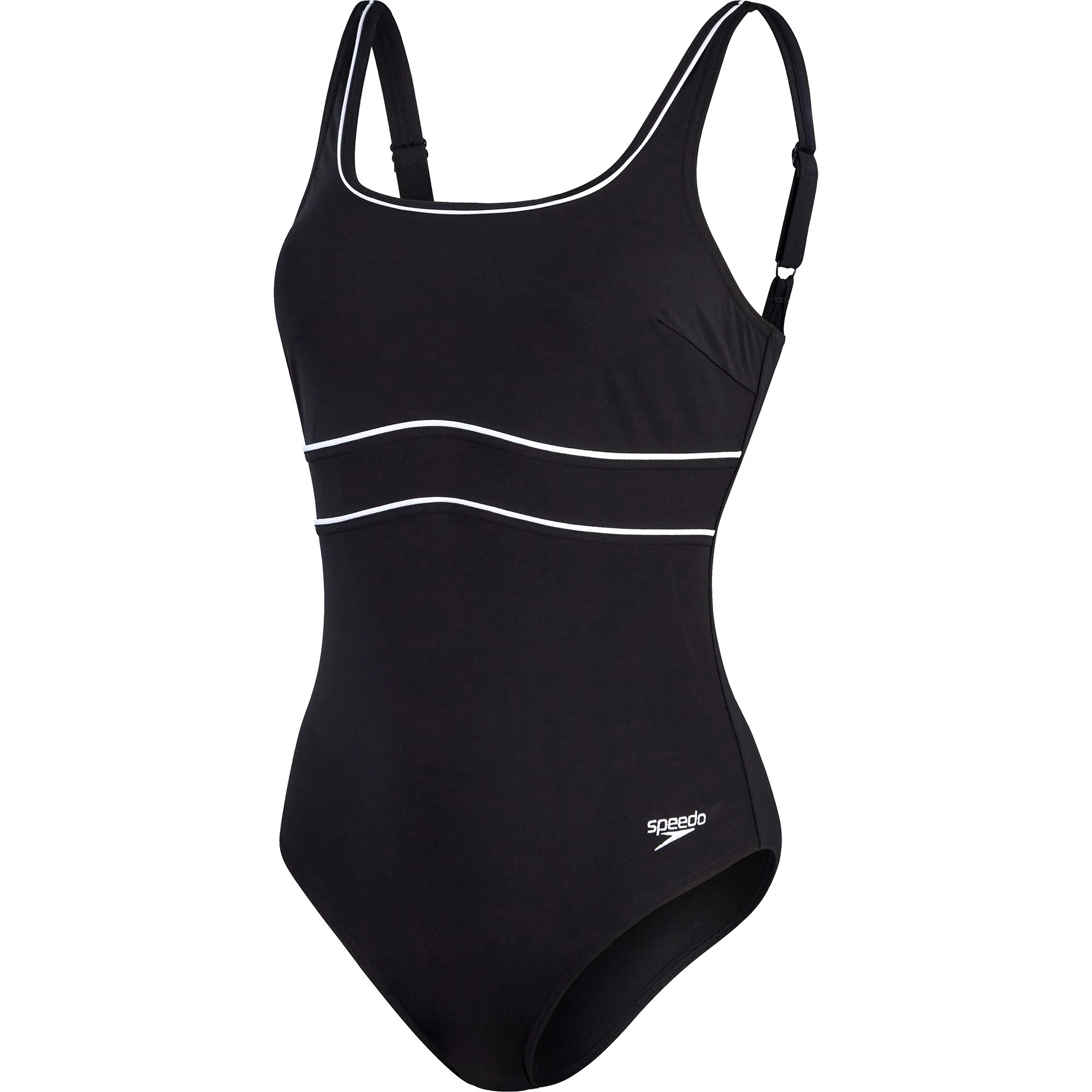The black ContourEclipse swimsuit with a sporty look features a square neckline and white underbust seams that draw the eye up and flatter your figure. Adjustable straps provide a great fit during workouts, while the shapewear fabric and seams support and flatter the bust and offer medium bust support. Speedo´s soft, new COMPREX ECO SHAPE fabric combines the most innovative shapewear products with the latest swimwear technology. LYCRA® XTRA LIFE™ is ultra-chlorine resistant and lasts twice as long as traditional swimwear fabrics – perfect for your regular workouts. ECO SHAPE COMPREX is made in part from recycled waste. The nylon yarn in the fabric is made from 100% pre-consumer waste, such as waste from factories.
